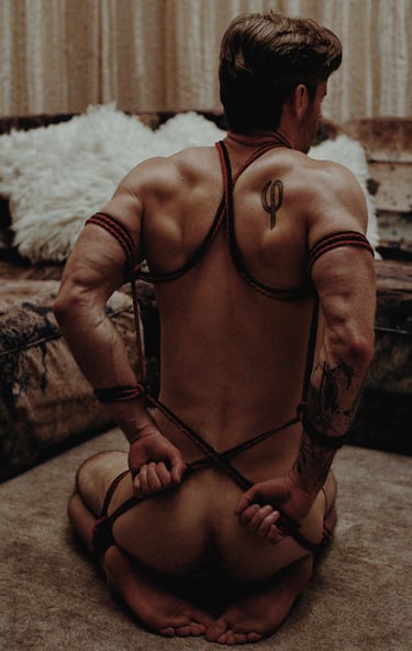Dan is a model that reached out to me over socials to set up a shoot. He wasn’t very familiar with bondage, but I knew from the pictures I had him send me of rope he liked that I wanted to do some hojojutsu ties on him (hojojutsu being the other leg of rope bondage in the West, especially for men). I was really worried about if it would hold together, being new to hojojutsu ties at the time, but with the dichromatic rope I was using, and his flexing in the ropes, it truly looked and felt incredible.